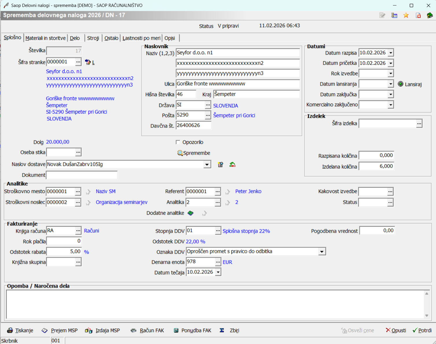 Ob kliku na gumb- Vnesi zapis (Insert) se odpre okno Delovni nalog.
