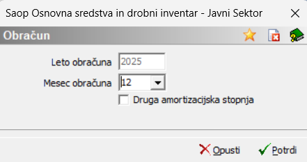 Dokončni obračun amortizacije izvedemo na glavnem meniju Obračuni in Inventura / Obračun. Ta obračun izvajamo konec leta. Ko sprožimo dokončni obračun, se nam poveča letnica v nastavitvah, v registru osnovnih sredstev in na samih karticah pa je zabeležena amortizacija. Izpis obračuna amortizacije ter registra osnovnih sredstev in drobnega inventarja najdemo pod gumbom za tiskanje v preglednici osnovnih sredstev.