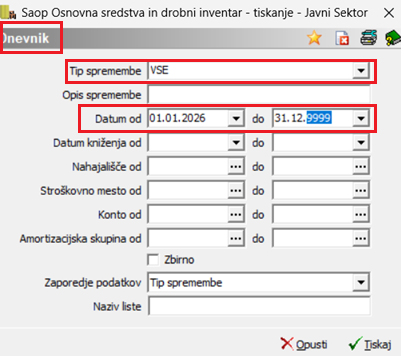 Opozorilo: V primeru, da nam pri obračunu program javi: 'Obstajajo knjižbe z višjim datumom, kot je obračun. Obračun ni dovoljen', je potrebno te knjižbe pobrisati in ponovno sprožiti obračun. Te knjižbe dobimo na izpisu Dnevnik / Tip spremembe VSE z datumskimi omejitvami od 1.1.2026 do 31.12.9999.