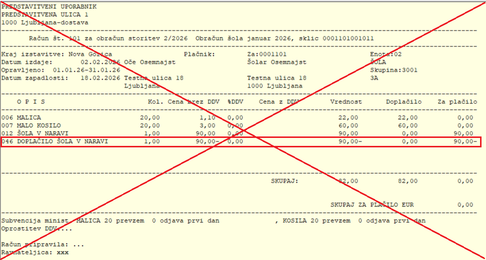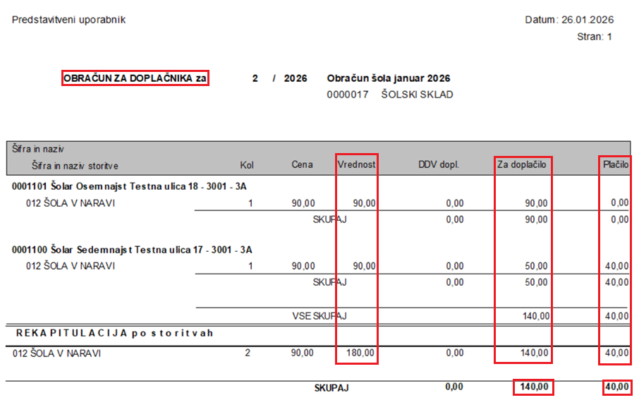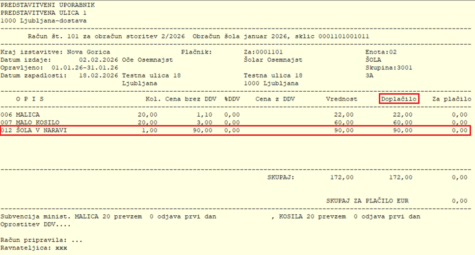 Spodaj vidimo primer izpisa za doplačnika. Vrednost šole v naravi je 180 eur, doplačnik plača 140 eur, starši pa preostanek 40 eur.
