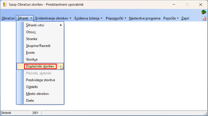 Doplačnike storitev vnesemo v Šifrantih – Doplačniki storitev: