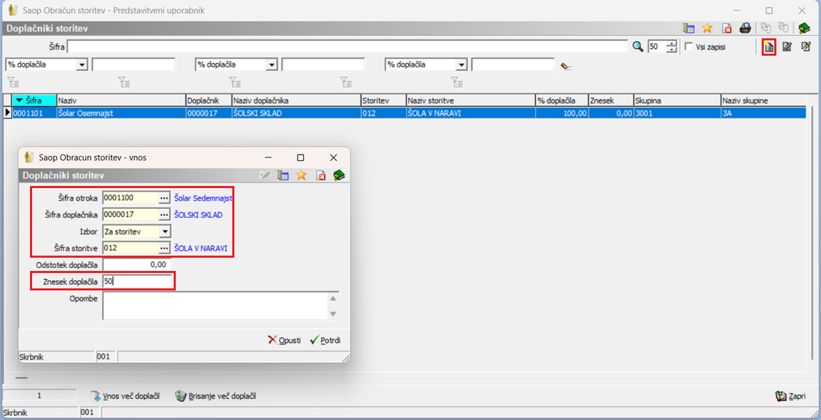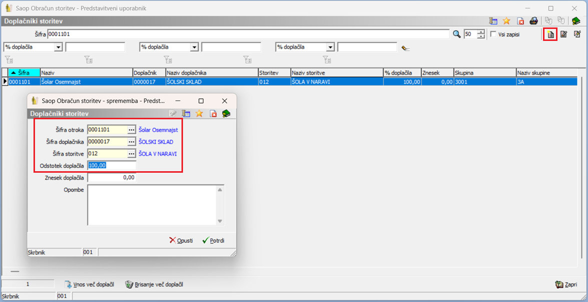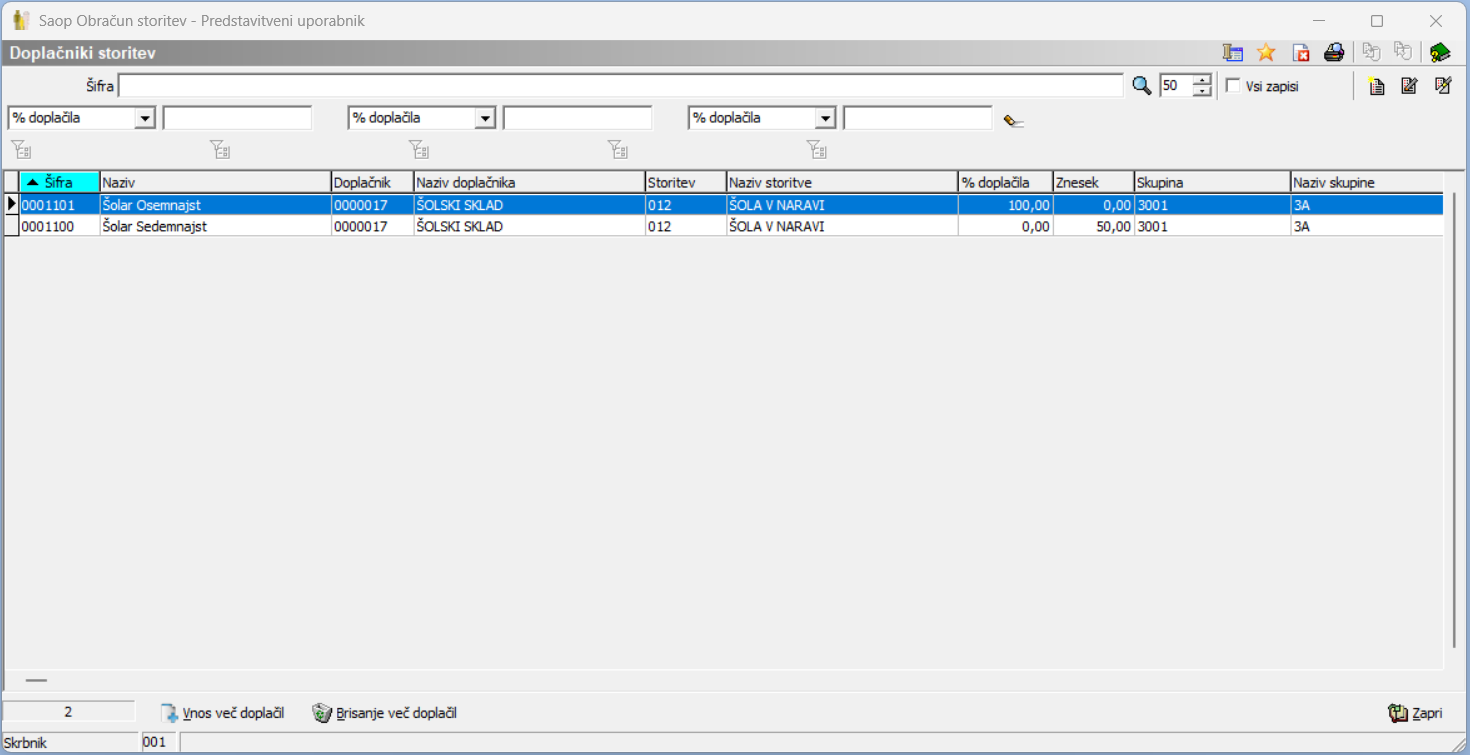 Na spodnji sliki vidimo primer obeh učencev. Pri enam smo vnesli doplačilo v odstotku, pri drugemu pa v znesku.