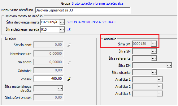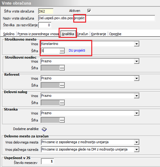 V tem primeru je potrebno, da imate na vrsti obračuna, katero uporabljate za izplačilo Delovne uspešnosti, na zavihku Analitika izbrano možnost – Privzame iz zaposlenega brez možnosti urejanja. To si uredite v šifrantu vrst obračuna na zavihku Analitika (Šifranti … Sistem obračuna … Vrste obračuna … izberete vrsto za DU … kliknete na popravi zapis … zavihek Analitika).