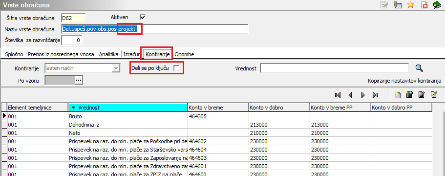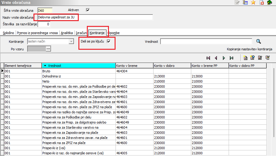 Če se poslužujete priprave temeljnice za knjiženje v dvostavno knjigovodstvo in imate urejene nastavitve za delitev po ključih in evidentiranje po SM in bi želeli, da se tudi vrsta obračuna Delovna uspešnost za JU deli po ključu (ključ je običajno redno delo) je pomembno, da imate na vrsti obračuna na zavihku Kontiranje oznako pri podatku Deli se po ključu. To si uredite v šifrantu vrst obračuna na zavihku Kontiranje (Šifranti … Sistem obračuna … Vrste obračuna … izberete vrsto za DU … kliknete na popravi zapis … zavihek Kontiranje).