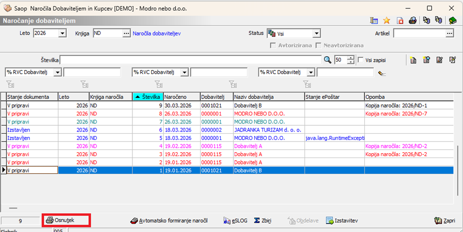 Postavimo se na naročilo dobavitelju, ki ga želimo izstaviti in kliknemo na gumb Osnutek.
