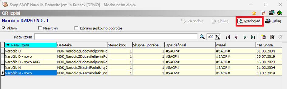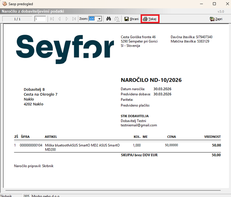Ob kliku na gumb Predogled se nam prikaže želeni izpis. Na tem mestu imamo vsaj 3 opcije, od tega 2 za pošiljanje naročilnice po-e pošti.