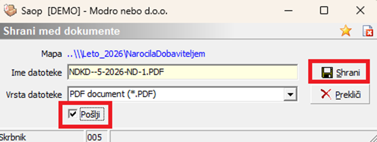 Na ta način se odpre okno za pošiljanje naročila po e-pošti. Dokument se ne zabeleži v SAOP dokumentnem sistemu.
