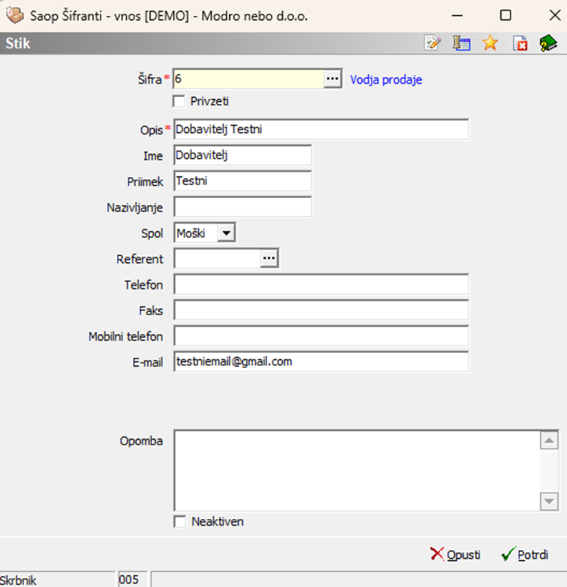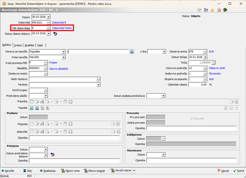 Pomembno:E-poštni naslov stika dobavitelja se nam avtomatsko predlaga le v kolikor imamo le-tega navedenega na samem naročilu, v podatkih stika pa vpisan e-poštni naslov.