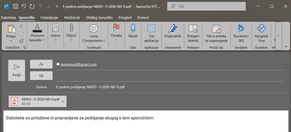 Po kliku na gumb Shrani se dokument shrani v dokumentni sistem in odpre okno za pošiljanje e-pošte.