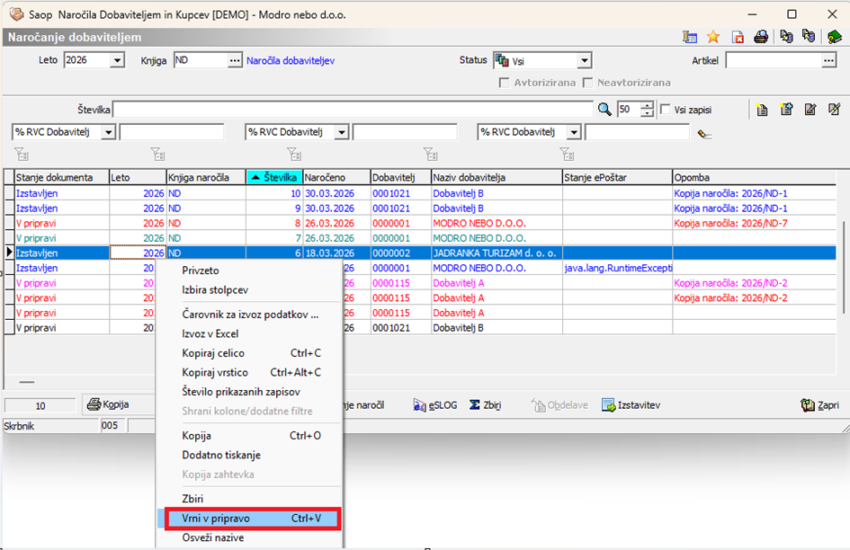 V kolikor želimo popraviti podatke na že izstavljenem naročilu, z desnim klikom miške kliknemo na vrstico kjer je naročilo in izberemo opcijo Vrni v pripravo.