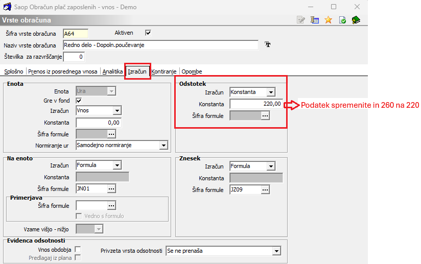 V šifrantu Vrst obračuna si na zavihku Izračun pri podatku Odstotek spremenite vrednost …