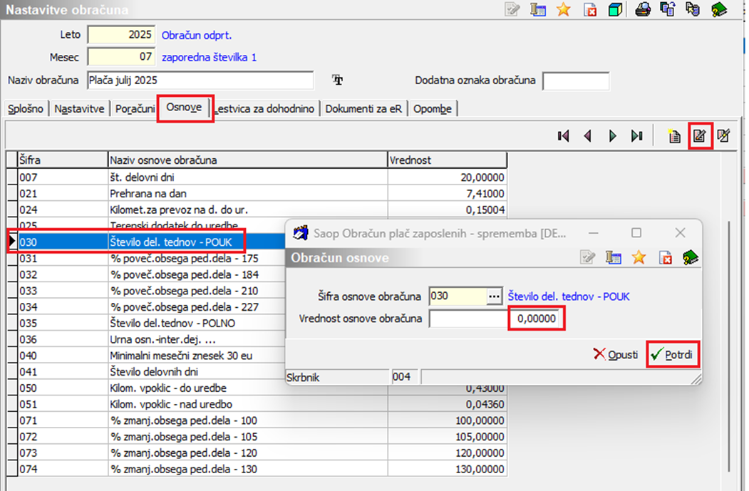 Ker zaposlenim pri plači za mesec julij in avgust ne pripadajo dodatki za povečan in zmanjšan obseg dela ter ure interesnih dejavnosti morate na šifrah osnov obračuna 030 (Št. del. Tednov pouk) in 036 (Urna osnova int. Dejavnosti) pri podatku vrednost osnove obračuna vpisati vrednost 0 (nič).