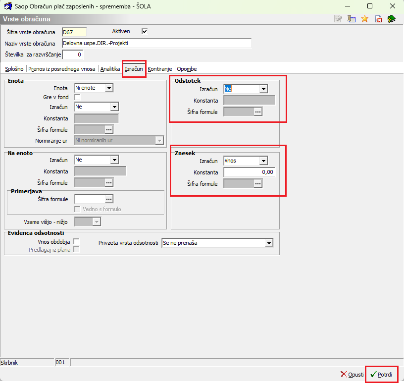 • Naziv vrste obračuna ustrezno poimenujemo, npr: Delovna usp. DIR.-Projekti,