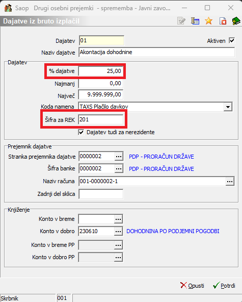 (Podatka o stranki prejemniku dajatve in konto sta informativna, namenjena zgolj prikazu vnosa podatkov). Iz šifranta strank izberete ustrezno stranko z bančnim računom, ki ga uporabljate za plačilo tega prispevka. Potrdite. Po vnosu Dajatev iz bruto morate imeti v šifrantu tri dajatve: