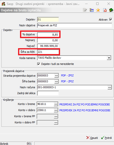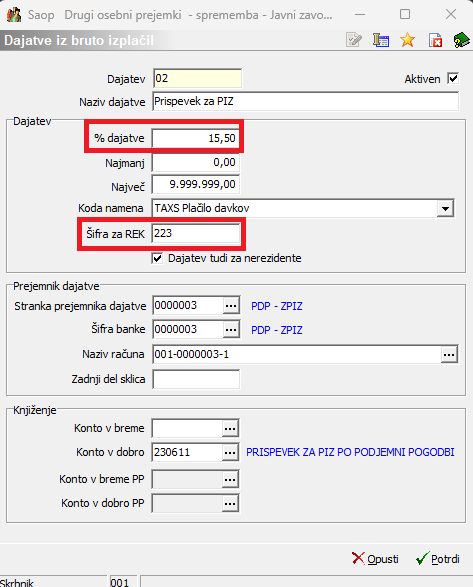 (Podatka o stranki prejemniku dajatve in konto sta informativna, namenjena zgolj prikazu vnosa podatkov). Iz šifranta strank izberete ustrezno stranko z bančnim računom, ki ga uporabljate za plačilo dohodnine. Potrdite.Še enkrat dodate nov zapis za vnos prispevka za PIZ.