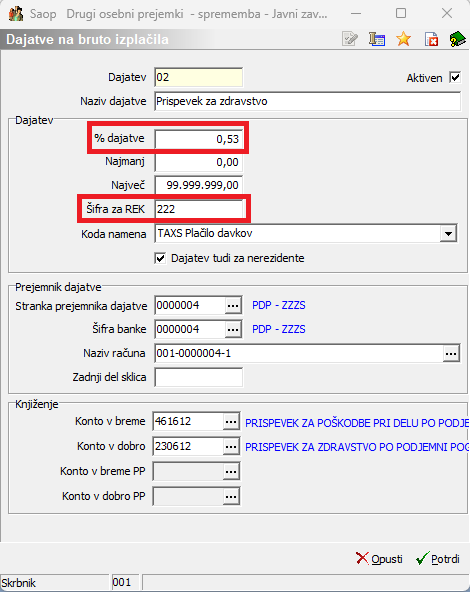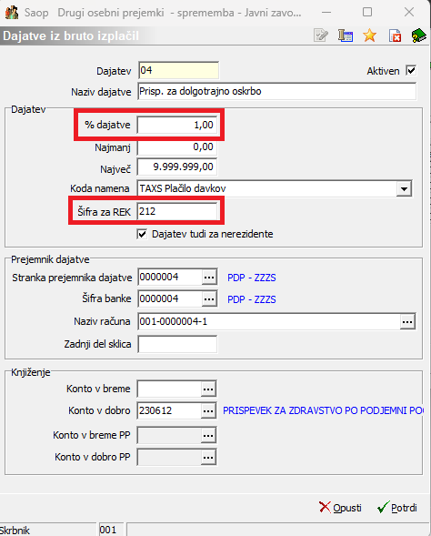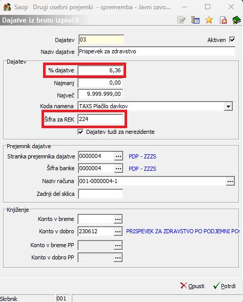 (Podatka o stranki prejemniku dajatve in konto sta informativna, namenjena zgolj prikazu vnosa podatkov). Iz šifranta strank izberete ustrezno stranko z bančnim računom, ki ga uporabljate za plačilo tega prispevka. Potrdite.Na enak način dodate še prispevek za zdravstvo – 6,36 %
