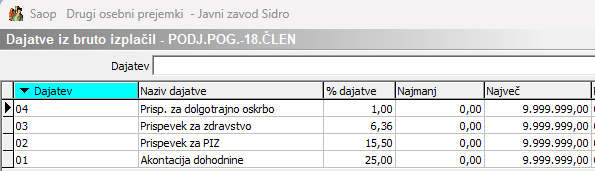 Po vnosu Dajatev iz bruto morate imeti v šifrantu tri dajatve: