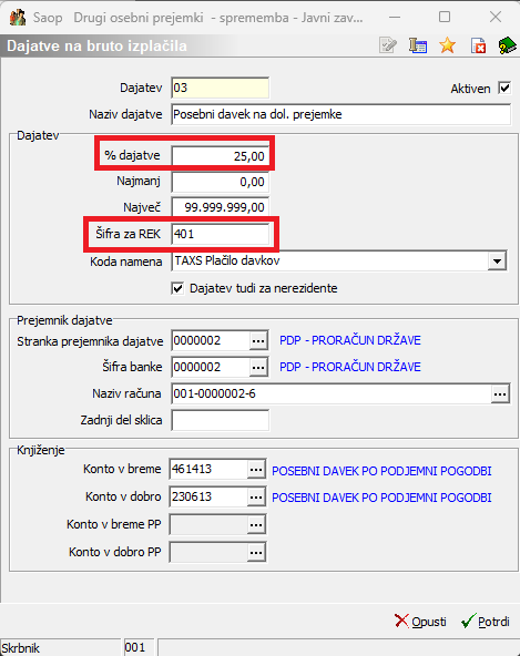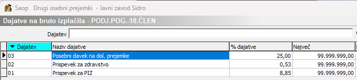 V šifrant Dajatve na bruto izplačila je potrebno dodati še ostale dajatve (prispevek za PIZ, prispevek za zdravstvo ter posebno dajatev 25 %).