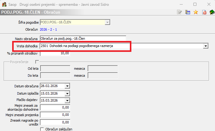 Obračun izvedemo v Saop programu Drugi osebni prejemki (DOP). Pred prvim obračunom si je potrebno urediti nastavitve, ki so v nadaljevanju navodila podrobneje opisane.Nastavitve programa Drugi osebni prejemkiKer v vrstah pogodb ni določene posebne vrstice za obračun podjemne pogodbe na podlagi 18. člena ZPIZ -2 predlagamo, da odprete novo vrsto pogodb.V programu Drugi osebni prejemki na osnovnem meniju izberete Nastavitve programa.Na zavihku Nastavitve pogodb izberete Nazivi pogodb.Da dodate nov naziv pogodbe, kliknete na ikono za Vnesi nov zapis.Izpolnite podatke na način, kot je to prikazano na spodnji sliki in potrdite.Po tem, ko ste vpisali nov naziv, je potrebno program Drugi osebni prejemki zapreti in ponovno odpreti, da se osveži seznam pogodb. Ko program na novo odprete, se dodana vrsta pogodb nahaja na meniju pogodb pod Vrste pogodb.Ponovno izberete na osnovnem meniju Nastavitve programa ter se postavite na zavihek Nastavitve pogodb.Na zavihku Nastavitve pogodb dodate nov zapis. Iz šifranta pogodb izberete nov naziv pogodbe, ki ste ga predhodno dodali v šifrant. Izberemo Šifra vrste prejemka – 1230, Obrazec REK-2, po potrebi določite konte. Polje Šifra posebnega davka - ker dajatve še niste vpisali v šifrant, je potrebno, da najprej dajatev vnesete v šifrant (postopek vnosa sledi v nadaljevanju navodila), nato pa se vrnete v nastavitve in dajatev izberete. V tej fazi pustite polje prazno.Potrdite.Postopek vnosa dajatevNa meniju Vrste pogodb se postavite na to novo vrsto pogodb. Izberete Dajatve ter nato Dajatve iz bruto izplačil. Tu je potrebno vnesti akontacijo dohodnine, 15,5 % prispevek za PIZ ter 6,36 % prispevek za zdravstvo.
