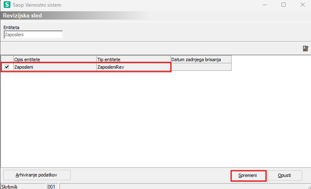 V oknu, ki se odpre, v vrstici Opis entitete, kjer so navedeni Zaposleni, dodamo kljukico. Spremembo potrdimo s klikom na gumb Spremeni.