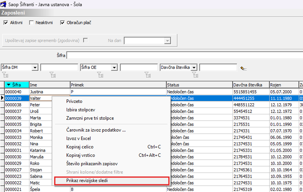 Revizijsko sled posameznega zaposlenega preverimo tako, da na zaposlenem kliknemo z desno tipko miške in v oknu, ki se odpre, izberemo možnost Prikaz revizijske sledi.