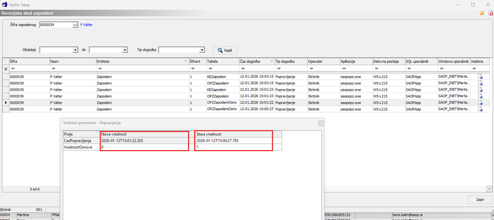 Z dvoklikom na želeno vrstico se odpre okno s prikazom starih in novih vrednosti zapisa.