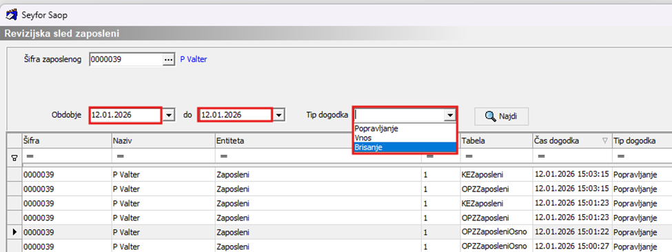 Na zavihku Revizijska sled dvokliknemo vrstico z zapisom Zaposleni.