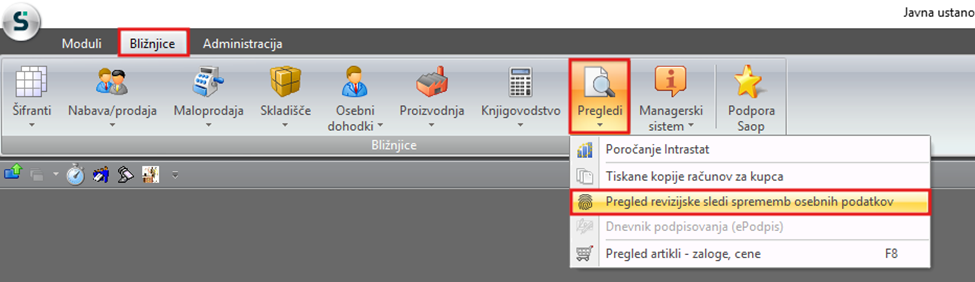 V Pregled revizijske sledi sprememb osebnih podatkov dostopamo prek zavihka Bližnjice, v razdelku Pregledi.