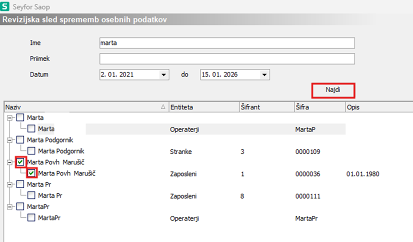 Izpolnimo iskalna polja, za katera želimo pregledati revizijsko sled, ter se časovno omejimo na obdobje, v katerem nas zanimajo spremembe.S klikom na gumb Najdi program prikaže najdene zapise.Z označitvijo kljukice pri Nazivih izberemo zapise, za katere želimo prikaz revizijske sledi, nato pa izbiro potrdimo z gumbom Potrdi.