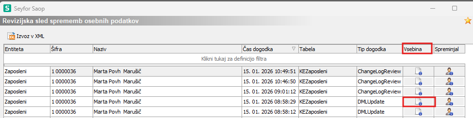 S klikom na ikoni v stolpcih Vsebina in Spreminjal pridobimo podrobnejše informacije o spremembi zapisa.