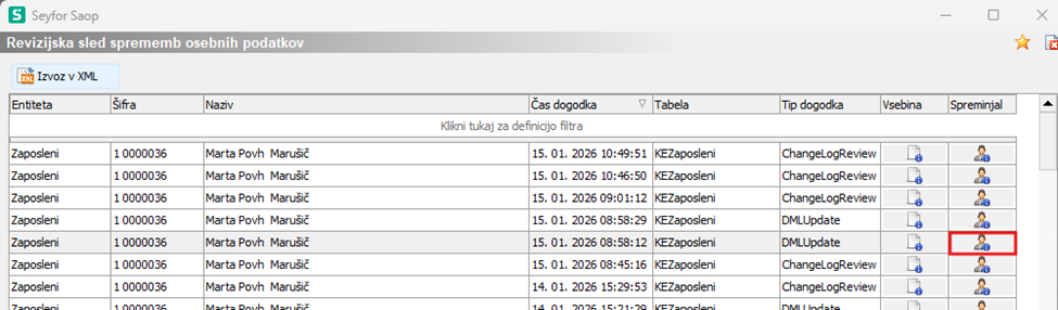 Odpre se tabela, v kateri je prikazan seznam sprememb za izbrano osebo.