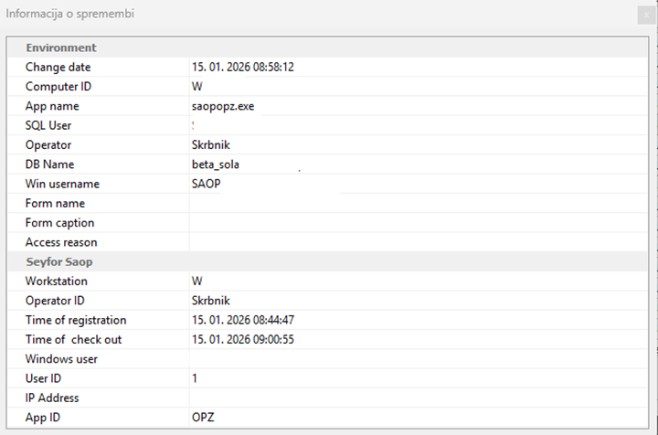 S klikom na ikono v stolpcu Spreminjal se odpre okno, v katerem so prikazani datum in čas spremembe ter operater, ki je spreminjal podatke.