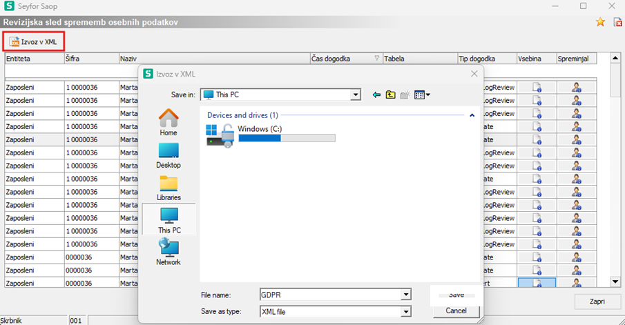S klikom na gumb Izvoz v XML se odpre spodnje okno, v katerem vnesemo ime datoteke in izberemo področje, kamor jo želimo shraniti.