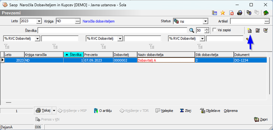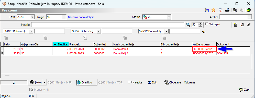 Po uspešnem knjiženju v Predprejem in prejem se na vrstici prevzema vpiše tudi vezna številka knjiženja dokumenta v skladiščno poslovanje.