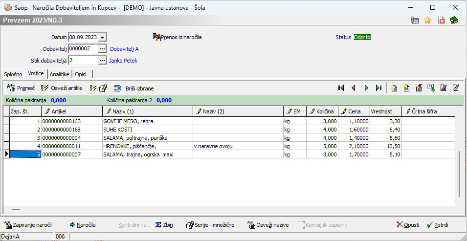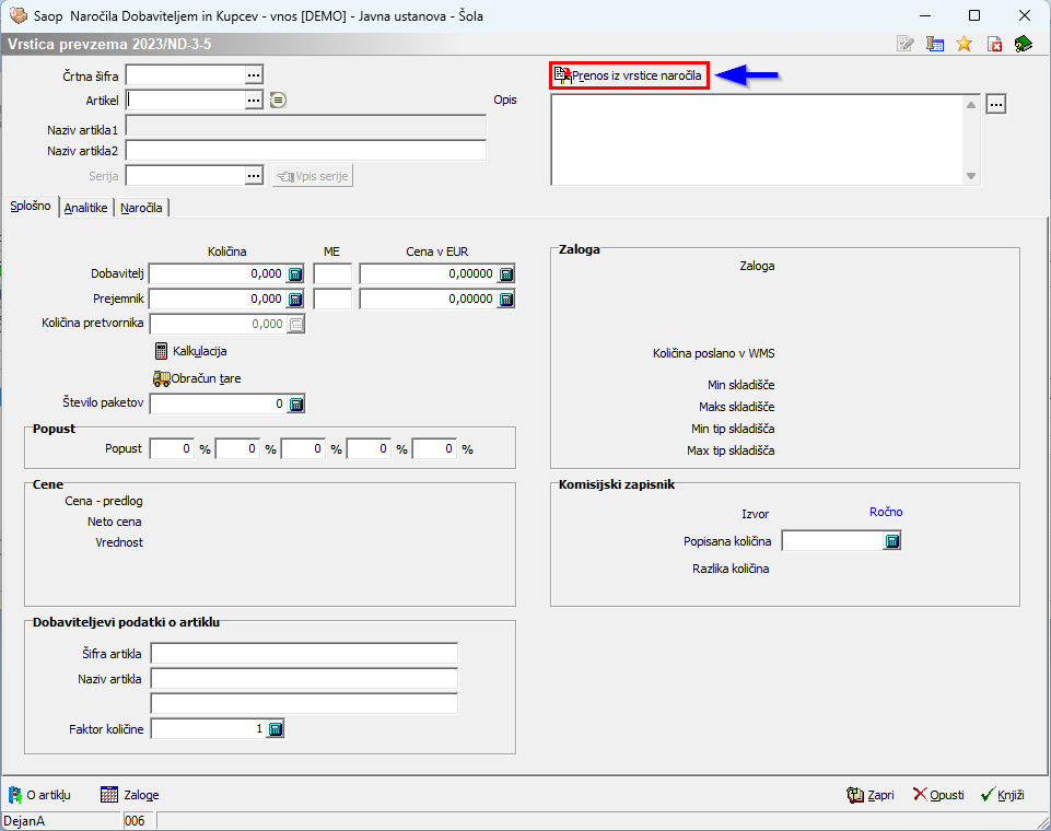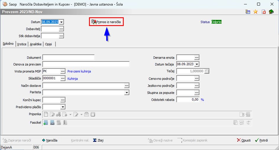 Če imamo naročilo dobavitelju že vpisano, ga sedaj preko gumba Prenos iz naročila prenesemo v prevzem.