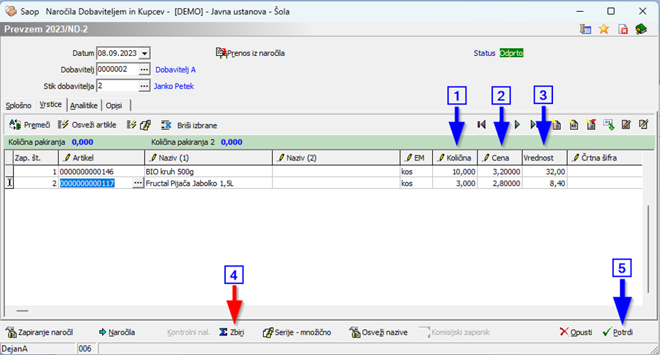 Ko so podatki urejeni kliknemo na gumb Zbiri. Tu preverimo skladnost prevzema z dokumentom dobave. Če je dokument skladen s prevzemom pritisnemo na gumb Potrdi (puščica z številko 5 na prejšnji sliki)