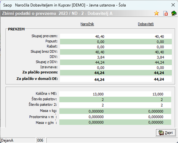 Na zavihku preverimo podatke dobave. Po potrebi podatke popravimo in če je smiselno uskladimo z dokumentom dobave.
