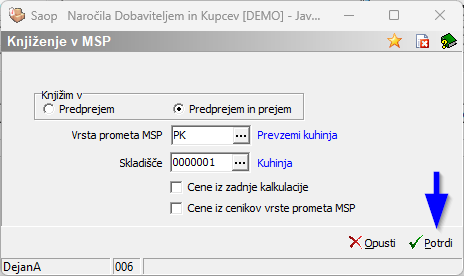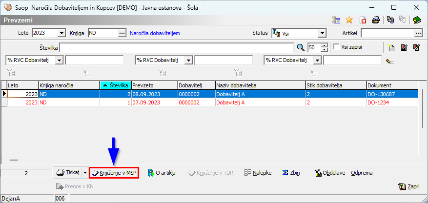 S klikom na gumb Knjiženje v MSP ga pošljemo v prevzem …