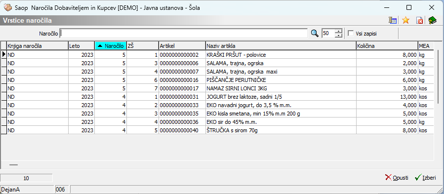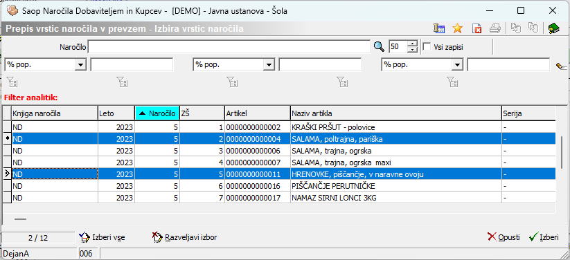Pojavi se seznam vseh artiklov, ki so na trenutno aktualnih naročilih dobavitelju. S kombinacijo tipke Ctrl in klikom na vrstice izberemo še dodatne vrstice.