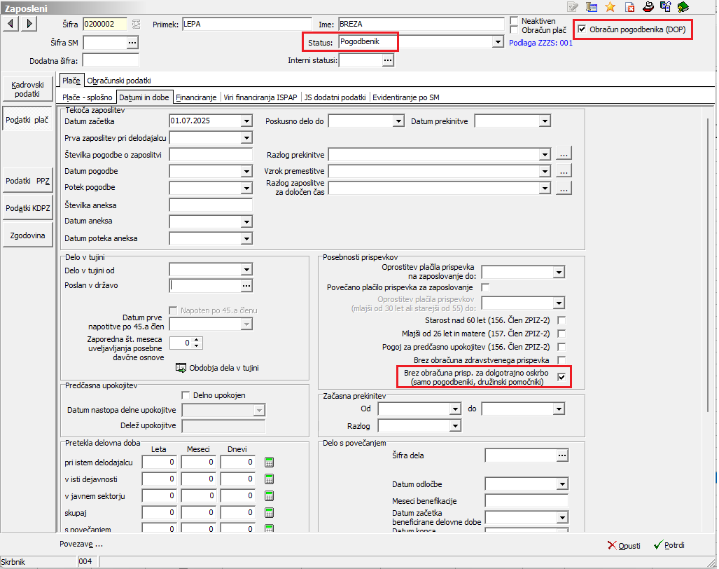 Pri obračunih v modulu DOP - Drugi osebni prejemki obstaja izjema od plačila Prispevka za dolgotrajno oskrbo in sicer se taka izjema označi na podatkih Zaposlenega oz. Pogodbenika. Na podatkih zaposlenega oz. Pogodbenika na zavihku Podatki plač – Datumi in dobe smo dodali novo polje Brez obračuna prisp. za dolgotrajno oskrbo.