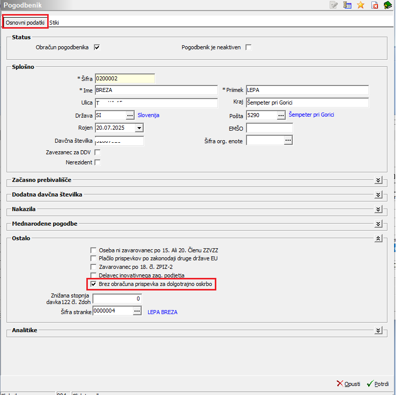 Odpre se nam okno s podatki pogodbenika in na zavihku Osnovni podatki po rubriko Ostalo dodamo kljukico v polje Brez obračuna prispevka za dolgotrajno oskrbo.