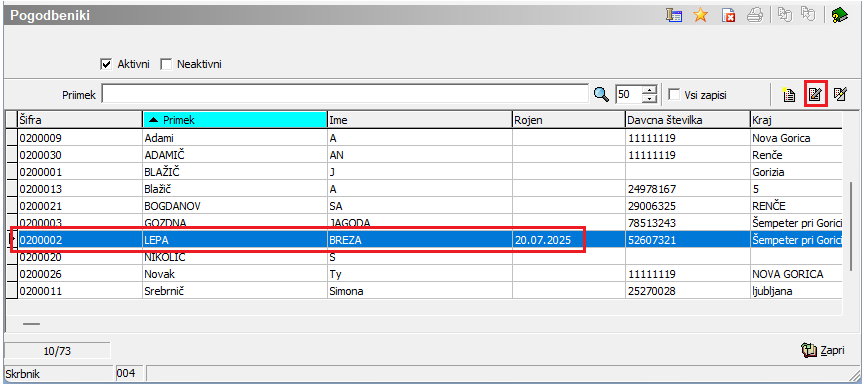 Odpre se nam okno vseh pogodbenikov, ki jih imamo vnesene. Postavimo se na pogodbenika, kateremu želimo urediti podatke in kliknemo na gumb Popravi zapis.