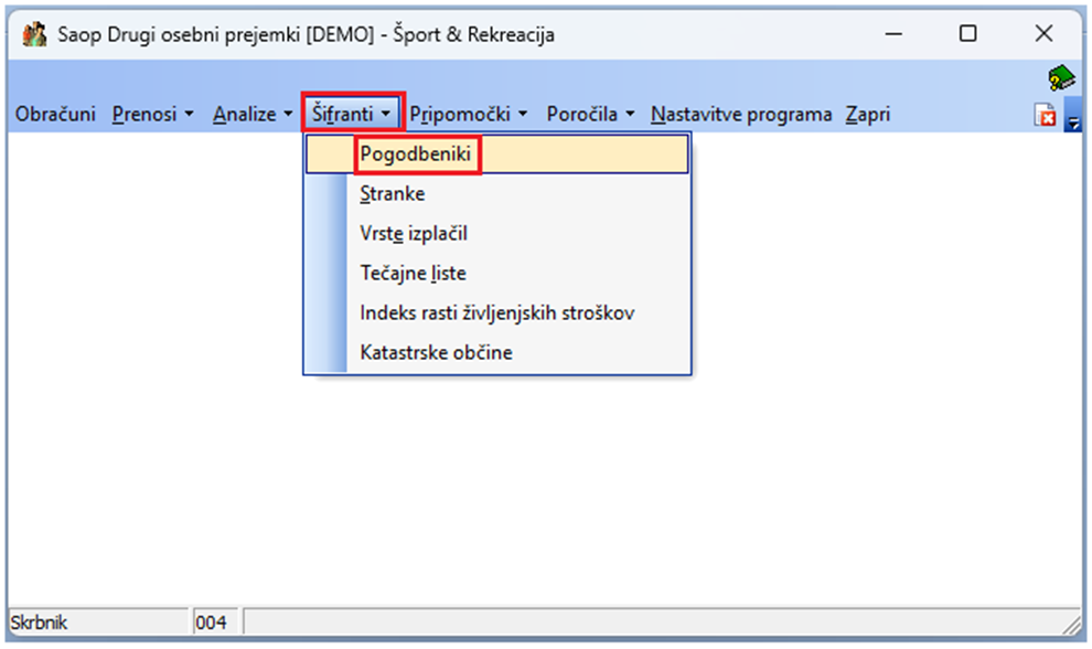 V kolikor dostopamo do šifranta pogodbenikov preko modula Drugi osebni prejemki, na osnovnem meniju v programu izberemo Šifranti…Pogodbeniki…