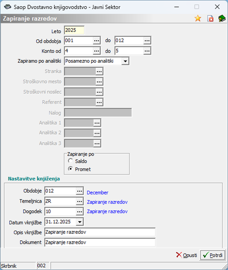 V spodnjem delu okna vpišemo še nastavitve za knjiženje temeljnice zapiranja razredov.