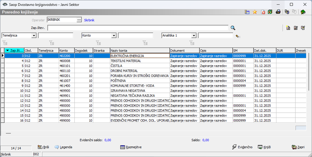 Postopek Zapiranje razredov je ponovljiv postopek. Če npr. s pregledom kontrolne bruto bilance ugotovimo, da nek konto ni zaprt, lahko v posrednem knjiženju vse knjižbe izbrišemo, kontu nastavimo manjkajoči konto zapiranja in celoten postopek ponovimo.Če je vse v redu, lahko vknjižbe prenesemo v glavno knjigo, tako da kliknemo .Tako zapremo vse stroške oz. odhodke in prihodke. V posredno knjiženje ročno doknjižimo še končne vknjižbe.