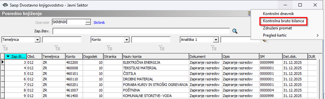 V posrednem knjiženju lahko s klikom na ikono v zgornjem desnem delu zaslona izpišemo Kontrolno bruto bilanco. To je bruto bilanca, ki upošteva tudi tiste vknjižbe, ki se nahajajo v posrednem knjiženju.