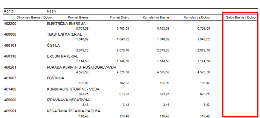 Z izpisom kontrolne bruto bilance preverimo ali so vsi konti razreda 4 in 7 saldirani.