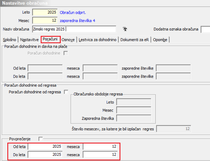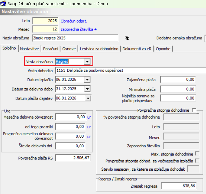 Obračun plač…Nastavitve obračuna… Ker se obračun zimskega regresa nanaša na leto 2025, ga je potrebno odpreti pod leto 2025, mesec 12, Naziv obračuna: Zimski regres