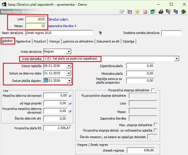 Določite še datum izplačila Zimskega regresa (v letu 2026). Datum za delovno dobo program sam predlaga. Določite tudi Datum plačila dajatev. Pod podatek Znesek Regresa vpišete znesek najvišje bruto izplačanega zimskega regresa (za leto 2025 veljavni znesek 638,86 EUR). Obvezno vpišete tudi podatek Povprečna plača RS!