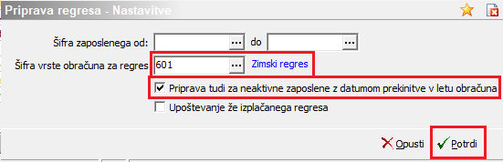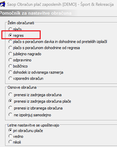 Z gumbom Potrdi potrdite Nastavitev obračuna za Zimski regres.